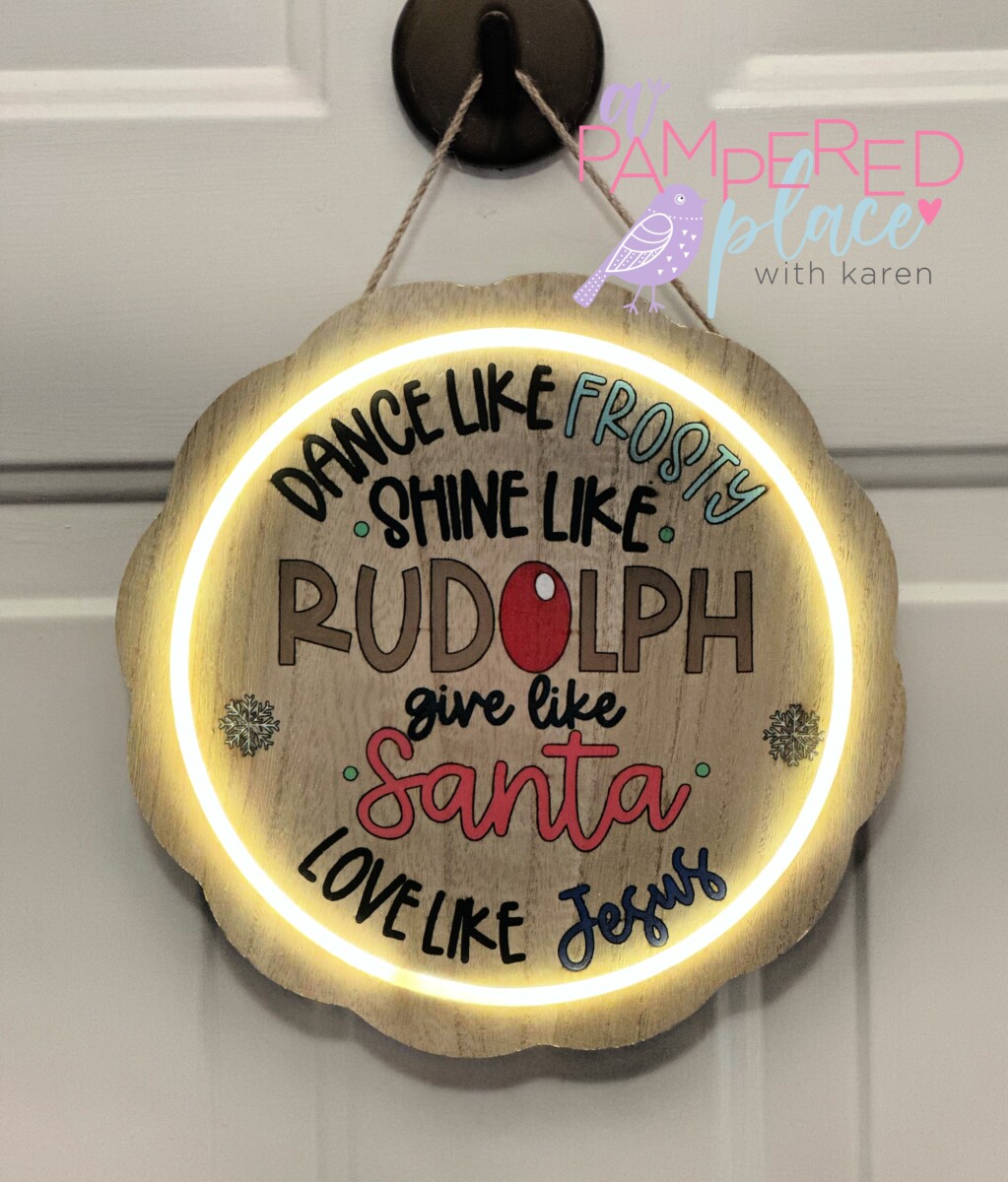 Hand-painted Dance Like Frosty LED sign adds holiday cheer and gentle glow to your wall or door. Laser-etched wood, 10″ scalloped round, battery-powered,