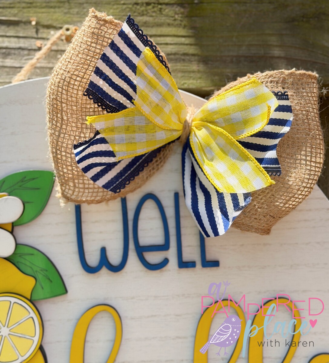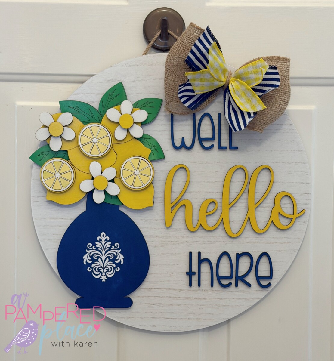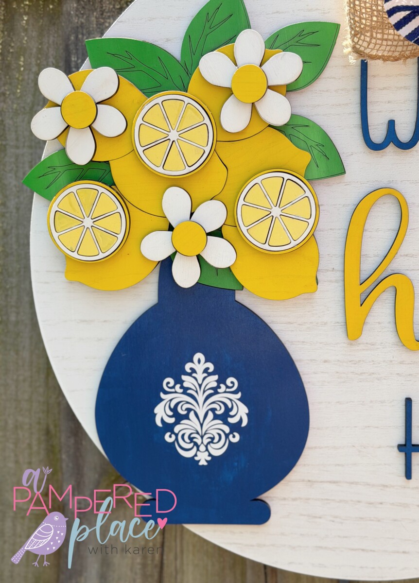 This handcrafted 18″ round door hanger features a beautiful layered design with a classic blue vase filled with bright lemons and florals, paired with raised lettering for a warm and inviting greeting. Each piece is laser cut and hand-painted, giving it a high-quality, dimensional look that stands out on any front door.