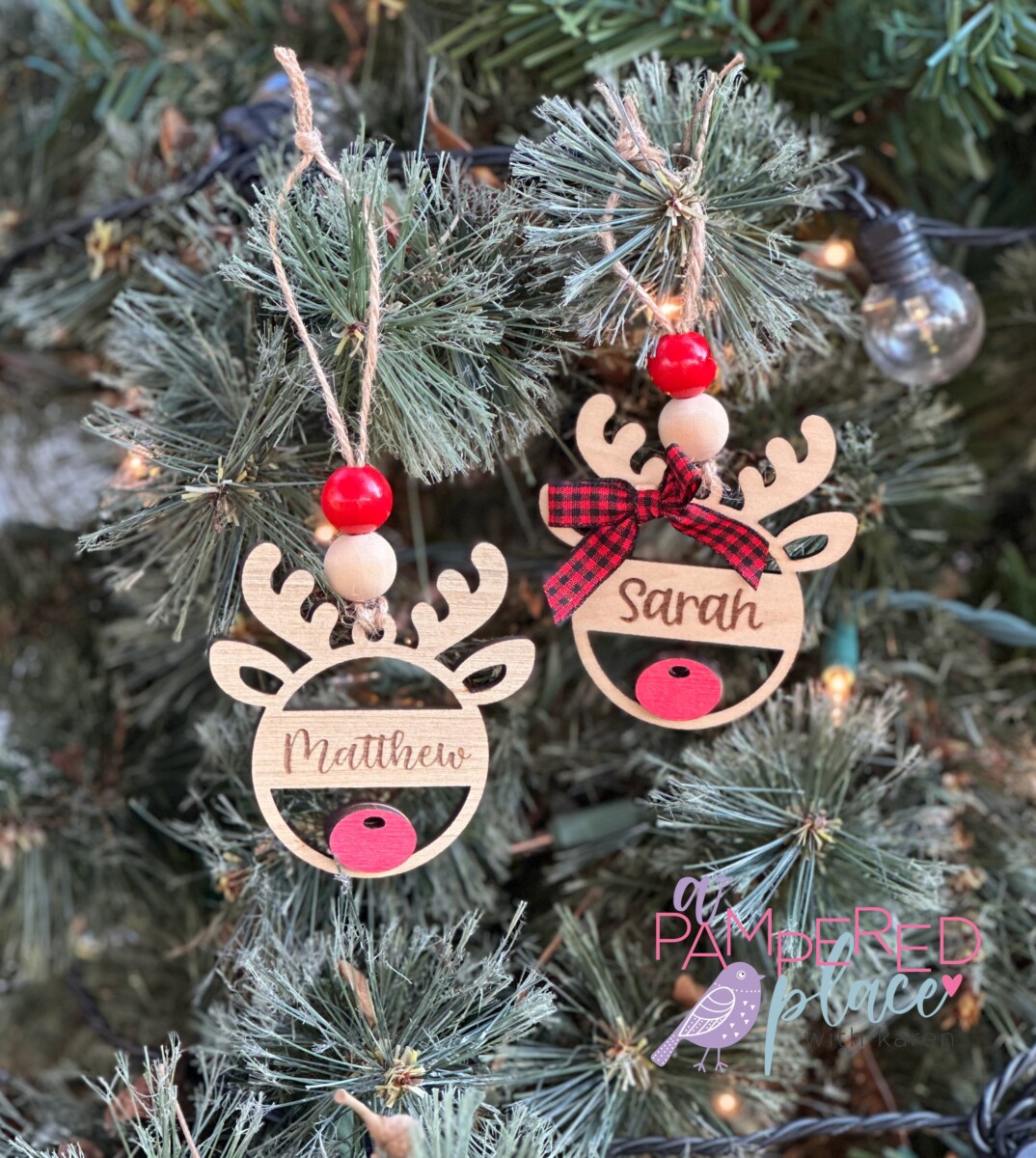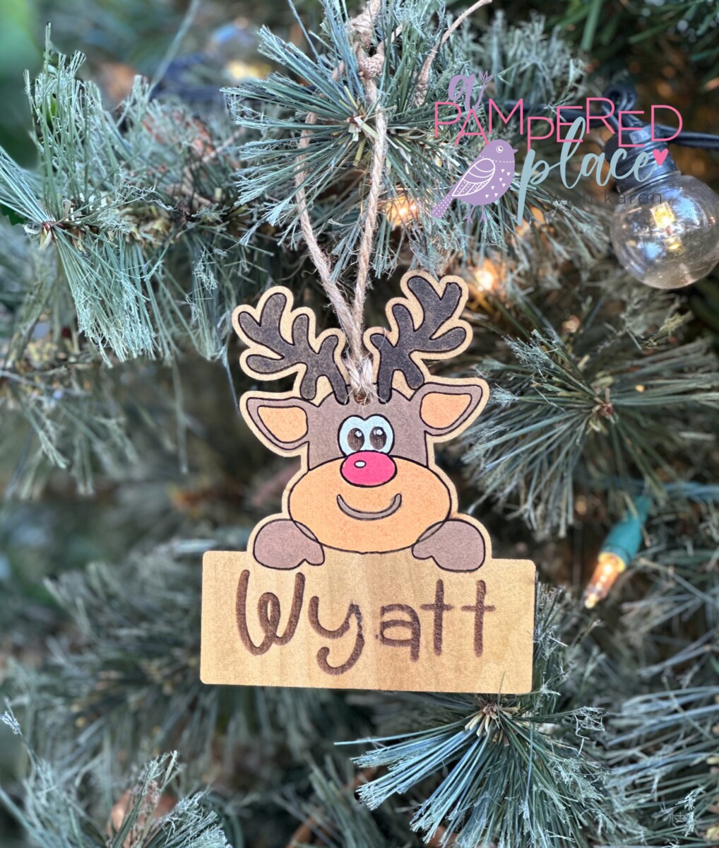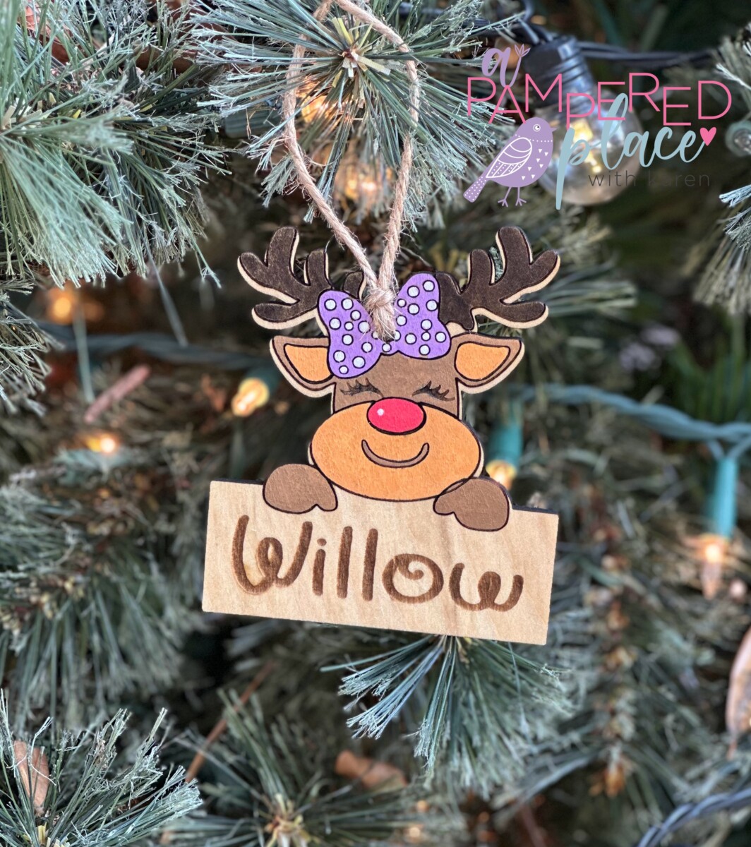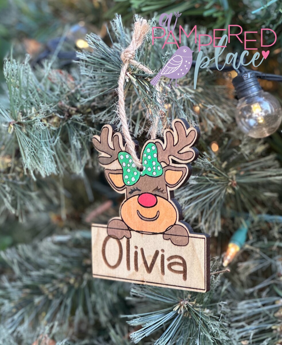 Bring extra holiday cheer to your Christmas tree with these adorable reindeer name ornaments! Each ornament features a smiling reindeer with a bright red nose, topped with a festive bow in your choice of color. Add a personalized name to make it a special keepsake for kids, family members, friends, or gift-giving.